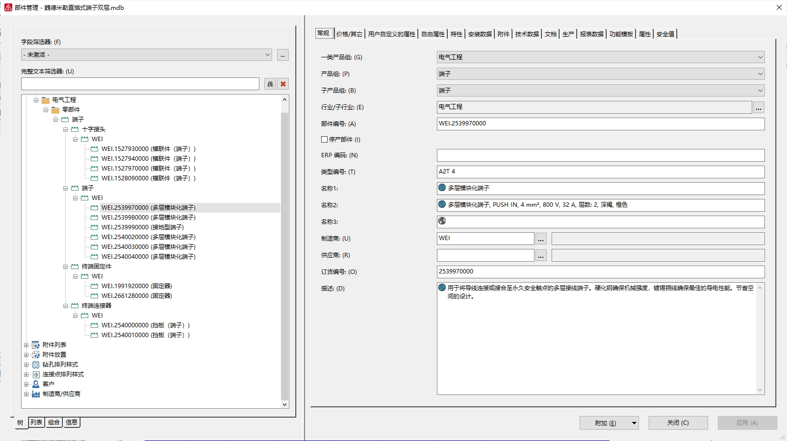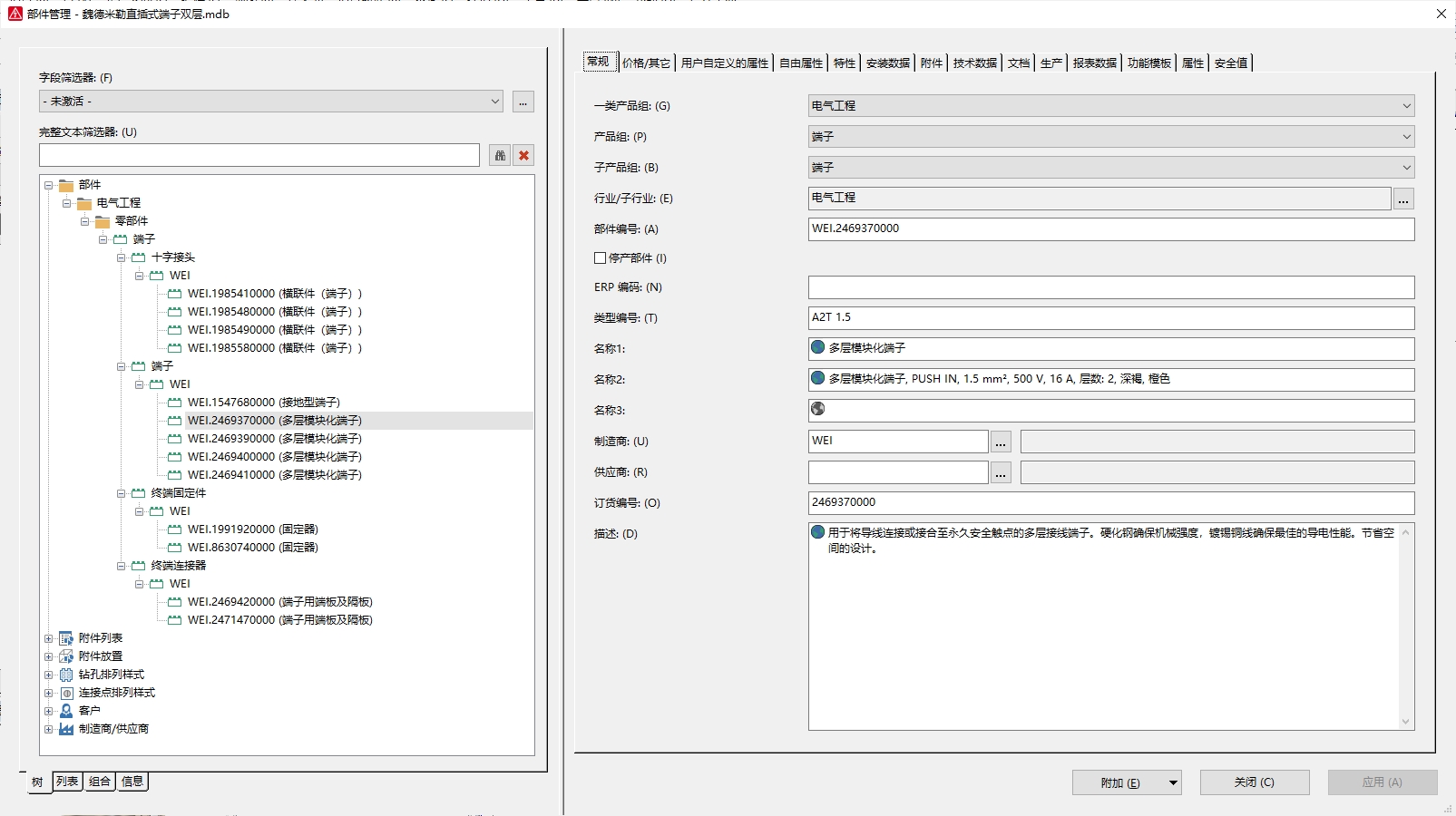 - EPLAN部件信息含:部件编号、名称、描述、3D宏、功能模板、图片等。