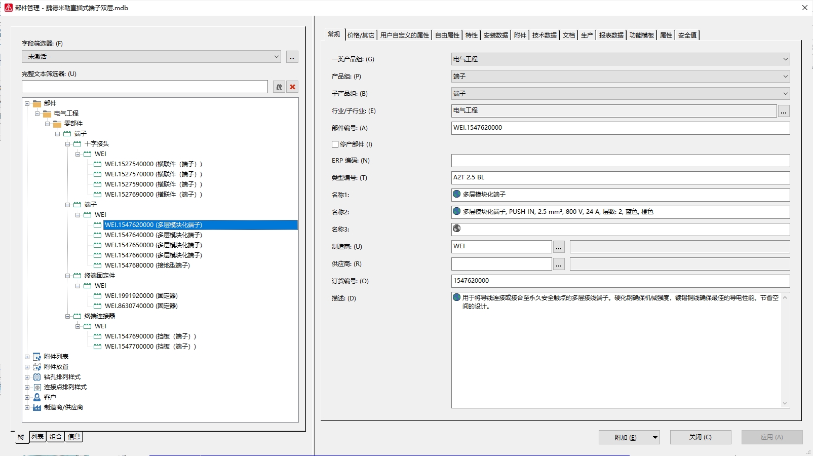 - EPLAN部件信息含:部件编号、名称、描述、3D宏、功能模板、图片等。