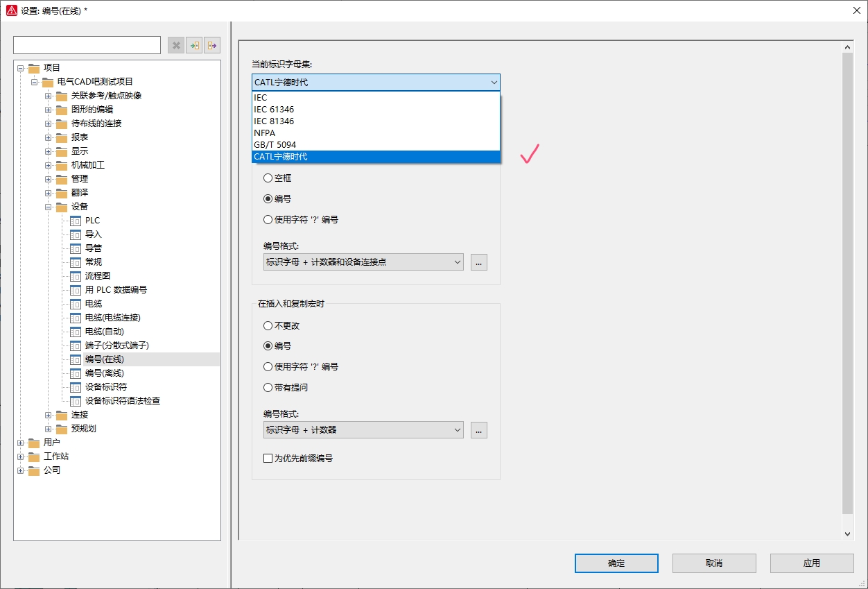 然后指定项目调用的字母集,在EPLAN>设置>项目>设备>编号(在线)右侧的“当前标识字母集”中选择刚导入的字母集即可生效。