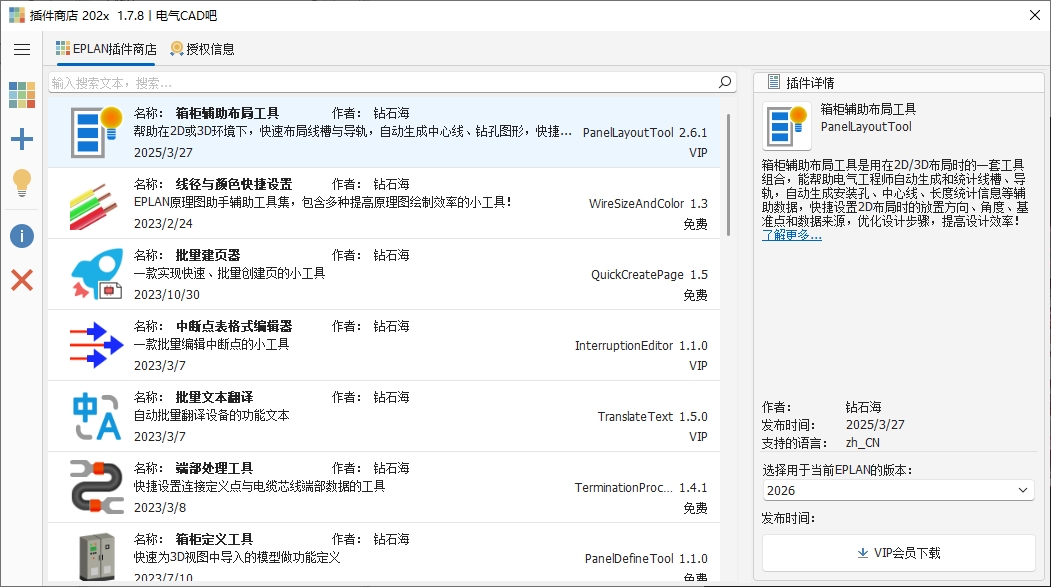 《EPLAN插件商店》已上线多日,经过多个版本的迭代目前可稳定运行在EPLAN各版本平台,现免费安装下载,插件商店主要提供了一个EPLAN插件的在线发布平台,用户只需安装一个“插件商店”主程序,便可按需快捷使用各类功能插件,插件商店授权分“免费”和“VIP”两种,购买VIP授权的会员仅可注册一台计算机或虚拟机(重装系统可免费重复申请),如果需要转移授权请先注销本机许可证,收回授权以便重新注册,由用户自己造成的授权遗弃(如电脑淘汰而未收回授权)时,第二台注册不免费且需额外支付。欢迎大家提供反馈意见,插件商店也将尽力满足大家需求,持续为国内企业和电气设计爱好者们提供更多优质和高效的功能插件![2026/1/4更新]
